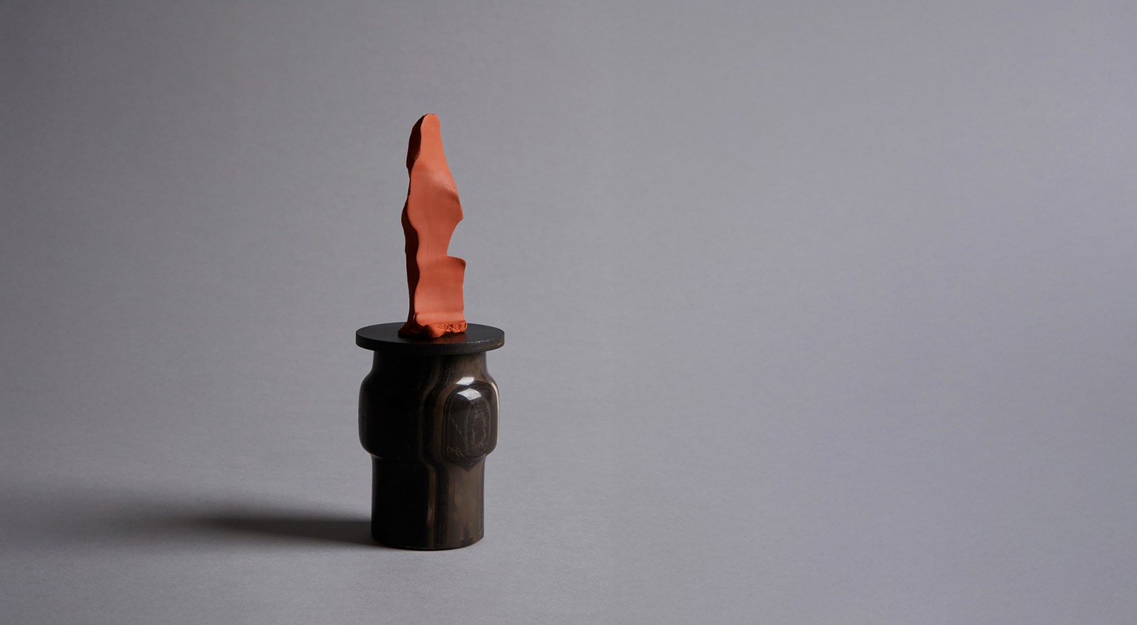 selectively burnished terracotta, blackened steel, marble aggregate concrete 24.5 x 10.5 x 10.5 cm