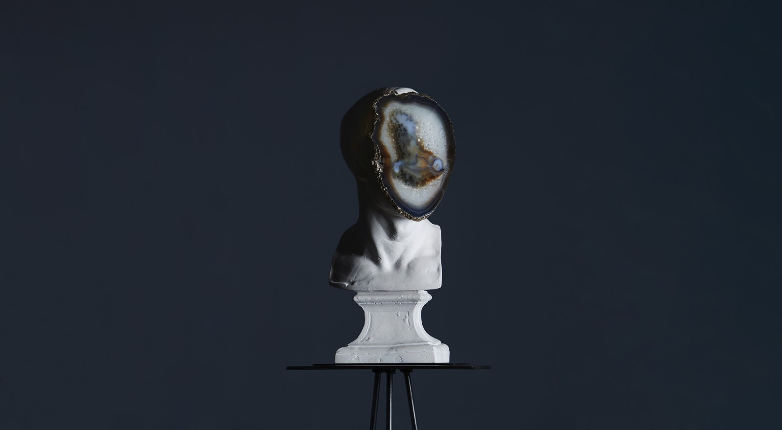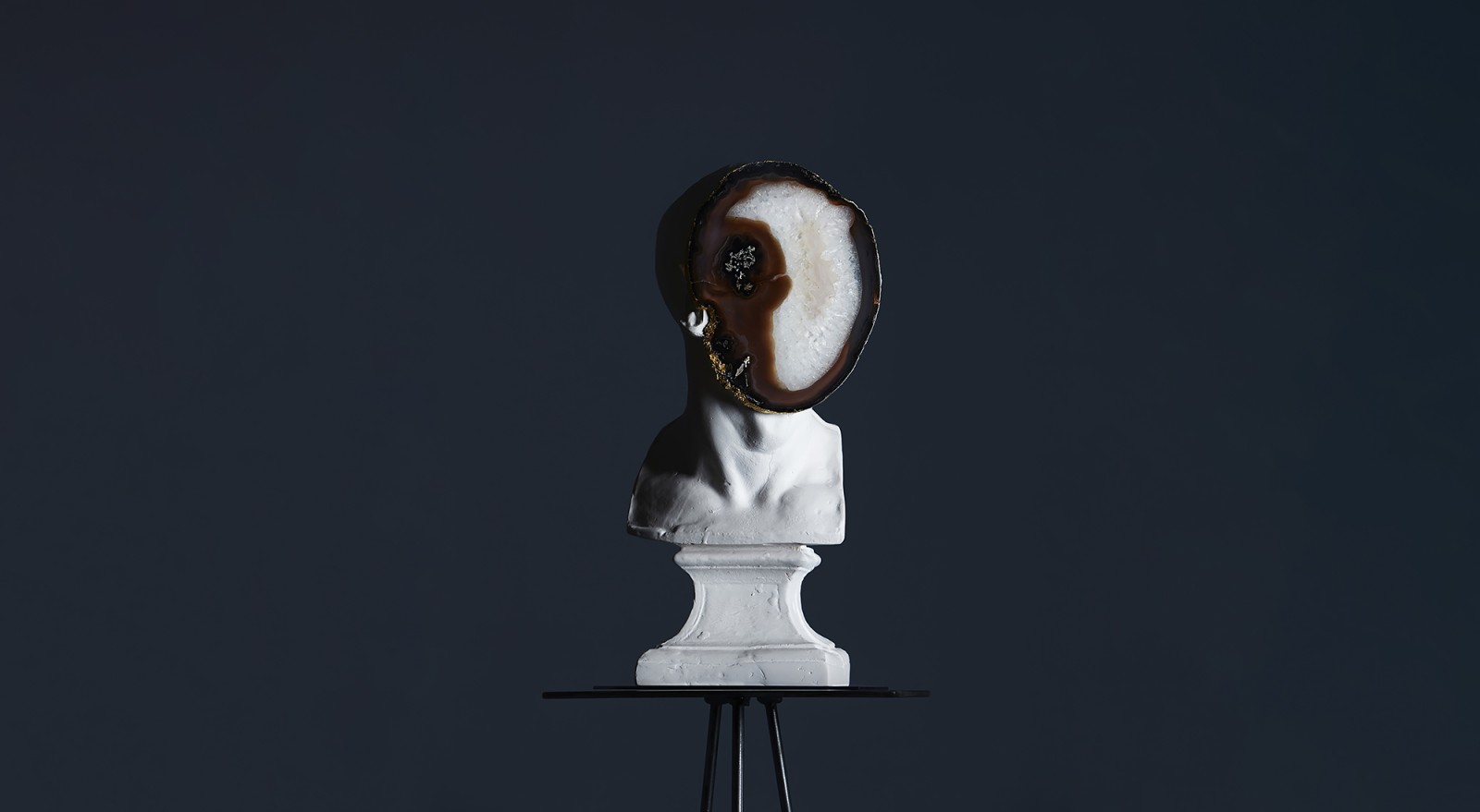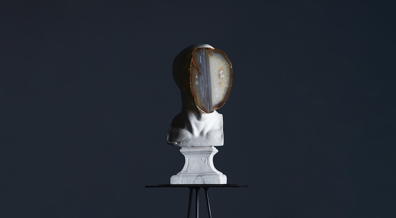 gypsum cement, titanium pigment, agate, gold leaf, silver leaf, blackened steel
