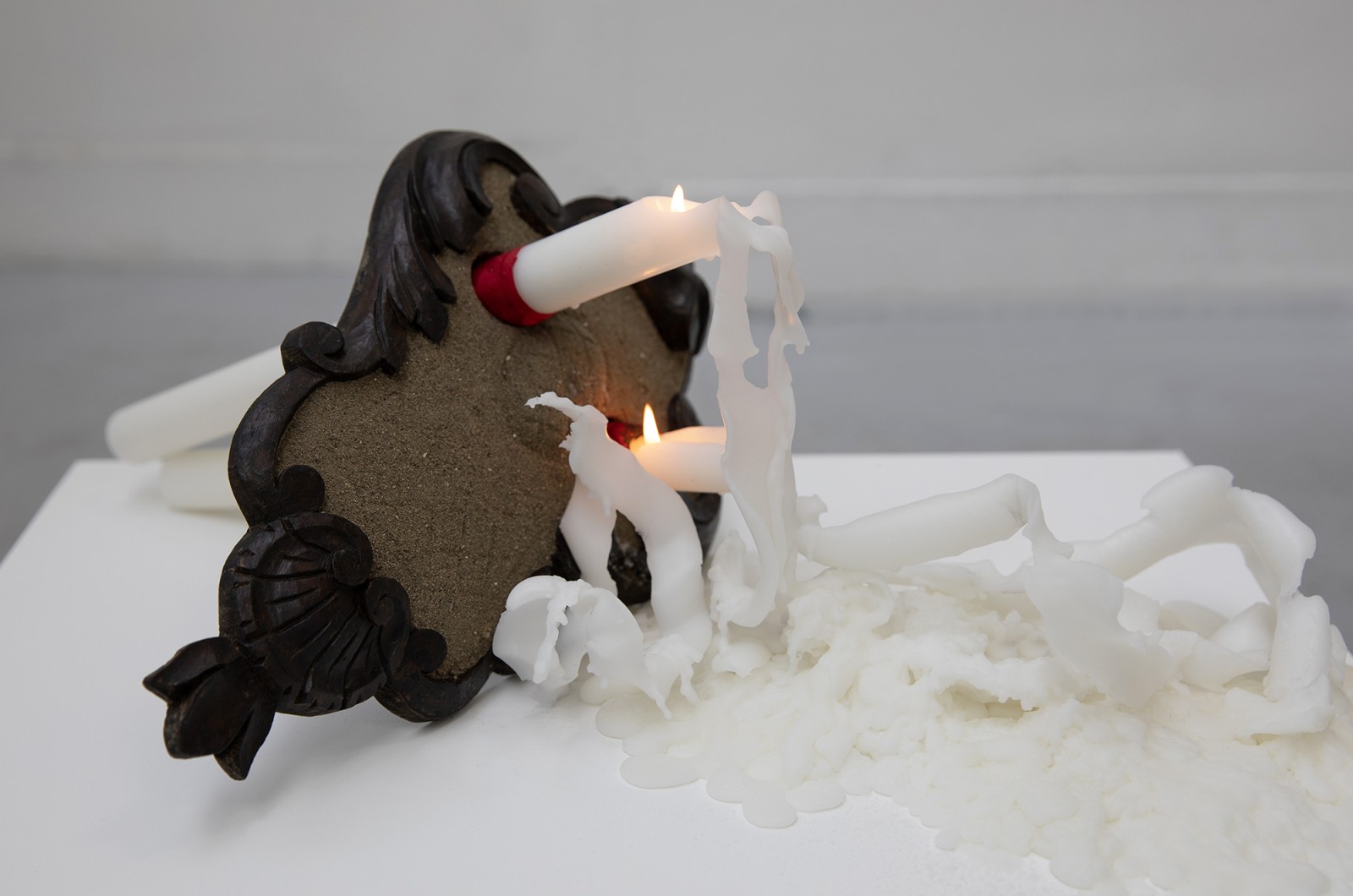 Baroque ornament resurfaced with sand and sediments excavated from the banks of the Tiber, church candles, antique damask